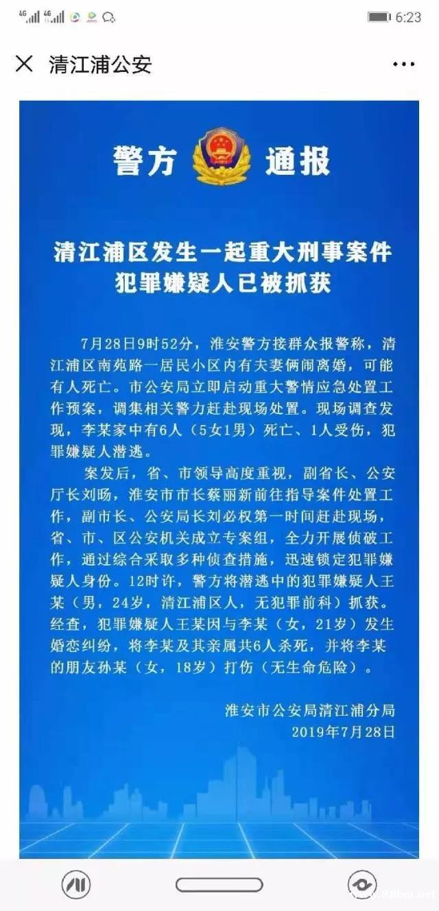 扬子晚报网消息,7月28日9时52分,淮安警方接群众报警称,清江浦区南苑路一居民小区内有夫妻俩闹离婚,可能有人死亡。淮安市公安局立即启动重大警情应急处置工作预案,调集相关警力赶赴现场处置。现场调查发现,李某家中有6人(5女1男)死亡、1人受伤,犯罪嫌疑人潜逃。