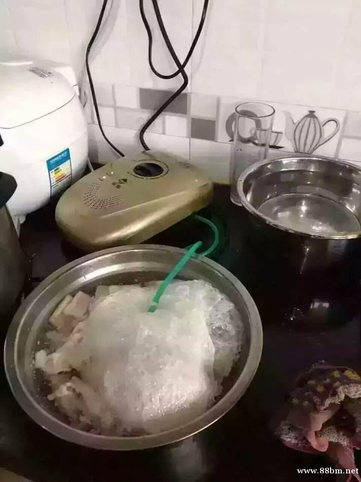 →把鸡、猪等肉类生食品表面清洗后,没入水盆内,水淹没肉类,将活氧气放入水中。停机时可见一层粘稠气泡浮出,实为添加剂、激素类物质,用火烧有化工的味道,可说明是将化学类物质分解出,而不是肉中蛋白质、脂肪类物质火燃烧后产生皮毛类烧焦的气味。10~15分钟