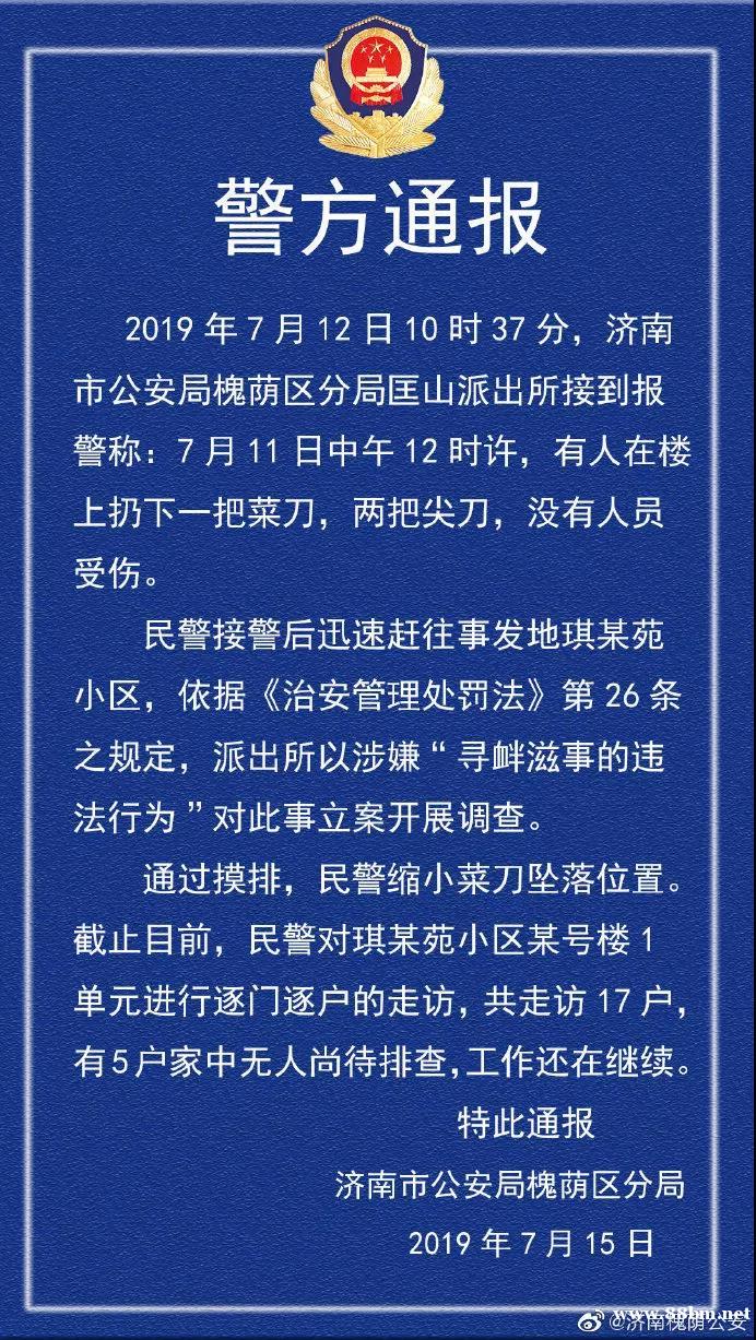 责任编辑:济南一小区高空坠落3把刀,警方通报来了!
